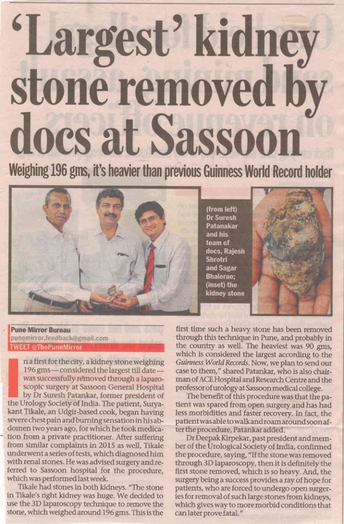‘Largest’ kidney stone removed by Dr. Suresh Patankar at Sassoon Hospital through laparoscopic surgery